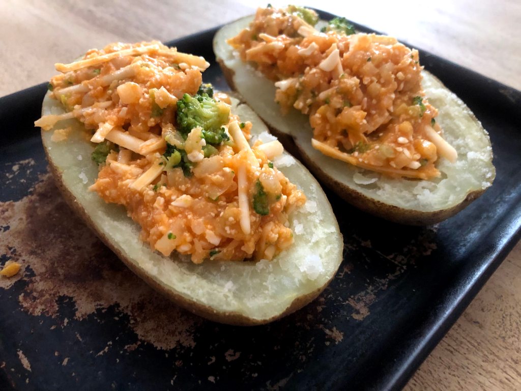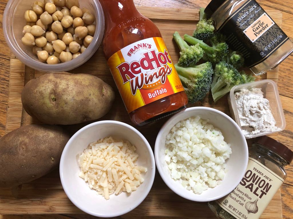 Bake the potatoes whole (oven, IP, microwave, etc). While potatoes are cooling, mash chickpeas in a bowl. Add veggies, buffalo sauce, vegan cheeses and spices. Mix well.