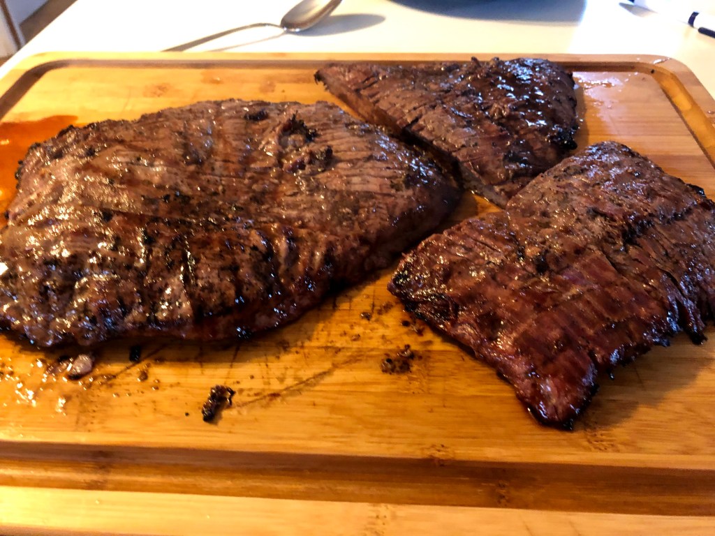 My family likes steak. And when I say “likes steak” I mean that each tween/teen/adult eats way more than the recommended 4oz serving. Even when I dole out only 4oz, everyone goes back for seconds. Even when half the plate is veggies. So I make extra. In this case, Costco’s twin pack of flank steaks.