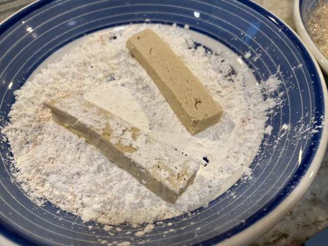 6. In assembly line fashion, dip tofu into cornstarch, wet flour mixture and then place on a parchment lined baking tray.