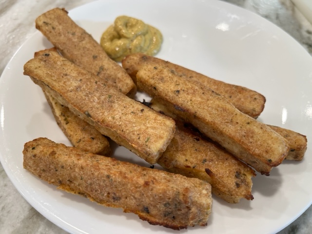 Serve with your favorite dipping sauce (BBQ, buffalo, ranch, honey mustard, thousand island, etc.) or chop and put over your favorite salad (vegan Caesar is awesome!).